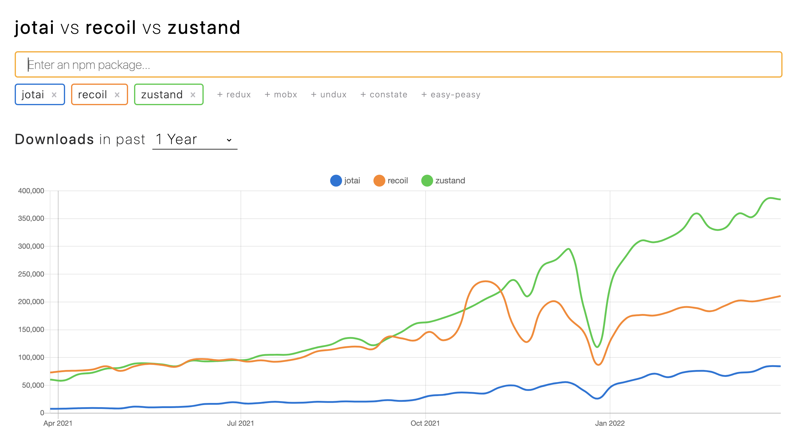 위 사진은 recoil, jotai, zustand의 다운로드 수를 비교한 것인데 zustand의 가파른 성장세가 눈에 띈다. 작년만 해도 recoil과 비등비등했지만 22년 3월을 기준으로 두 배의 격차를 두고 고공 행진 중이다. 상태 관리 생태계의 새로운 삼국지가 시작됐고, 앞으로의 동향이 기대된다.